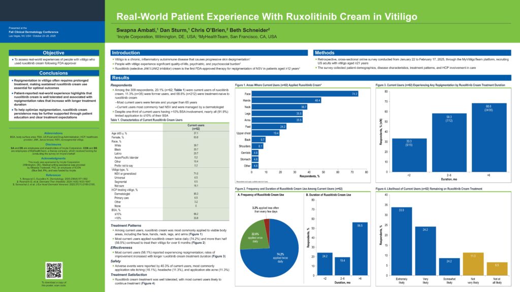 For this research presented at the 2025 Fall Clinical Dermatology Conference, 309 members of MyVitiligoTeam were interviewed about treatment experiences, including 62 people currently taking a recently approved FDA treatment. The research suggested that re-pigmentation can take time and the need for patience. Importantly, the findings provide dermatologists with data to help them set clear expectations for the time it typically takes to start seeing results, which can improve treatment adherence.